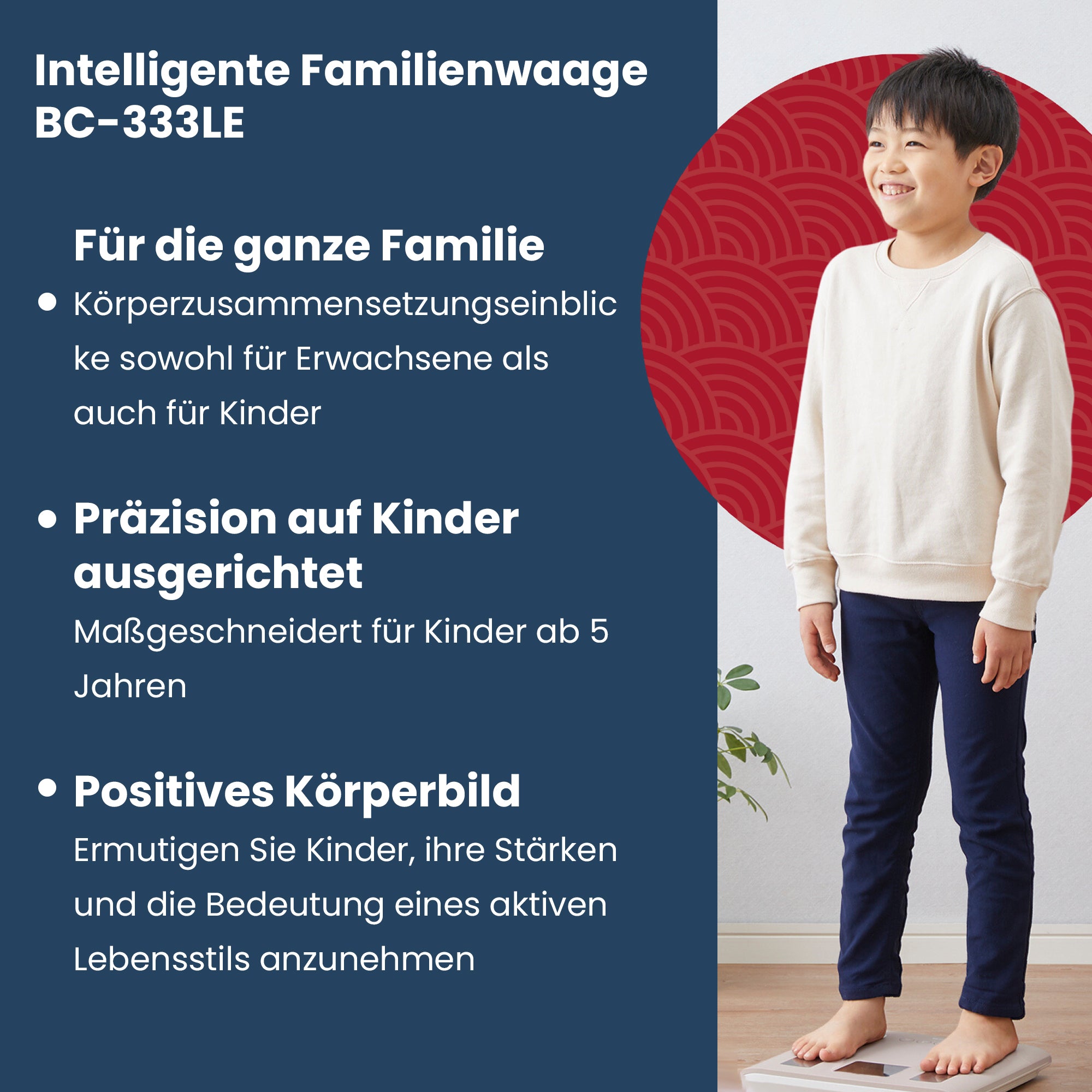 Körper abgestimmt ist.Einzigartige Muskelmasse-Analyse für Kinder: Diese Funktion bietet Ihnen einen seltenen Einblick in die körperliche Entwicklung Ihres Kindes, indem sie die Muskelmasse ab einem Alter von fünf Jahren misst. Fördern Sie ein positives Körperbild und stärken Sie das Selbstbewusstsein Ihrer Kinder durch die Betonung ihrer Stärke.